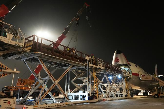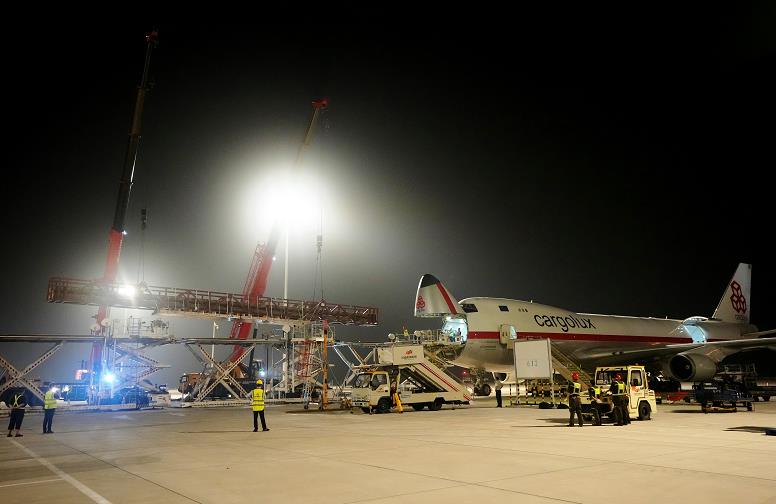 據測算,26.25米約相當于9層樓高,約占當天承運貨機機身長度的1/2。河南航投盧森堡項目管理部工作人員介紹說,由于飛機地板結構有承重限制,超大貨物需特殊的運輸方案。為確保安全,盧森堡貨航量身定制了組板和安保等專項方案,對貨物入庫、裝機準備、貨物裝機等流程詳細安排,并特別組織了工程師技術團隊到鄭州現場調度指揮。據了解,現場配備了2臺70噸吊車和3臺35噸平臺車保障裝機。航班降落前3小時,盧森堡貨航工作人員就引領相關車輛和設備到停機坪就位做好工作準備。