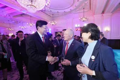 貝泰爾在招待會的致辭中簡要回顧了商貿團在北京和上海的交流情況,對參加招待會的各方代表表示感謝。致辭后,講臺上的貝泰爾看到張明超一行很是驚喜,立即向老朋友們舉手示意,并在隨后的自由交流環(huán)節(jié)與盧睿朗一起同張明超交談。
