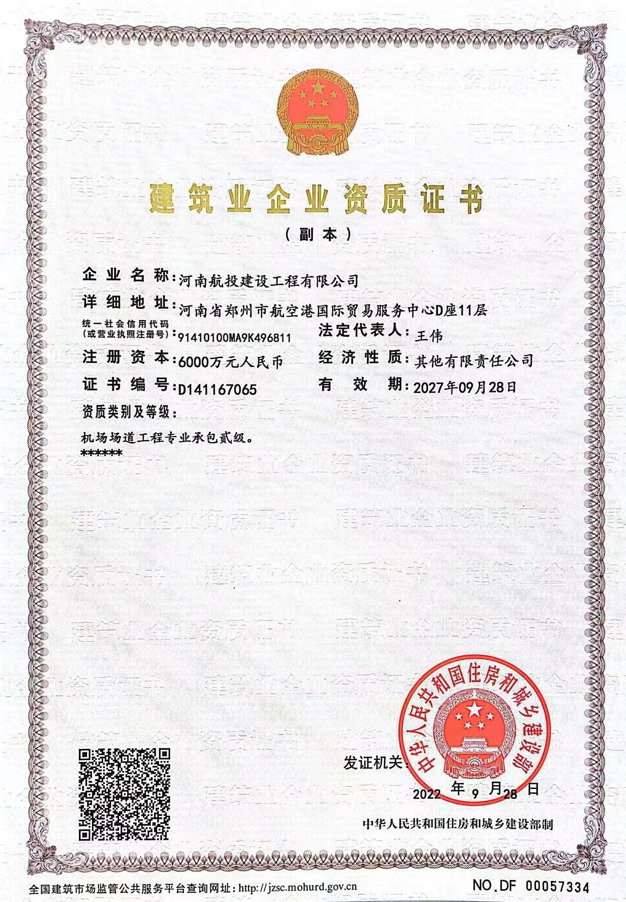 航投建工由河南航投集團旗下河南航投航空基礎(chǔ)產(chǎn)業(yè)發(fā)展有限公司與貴州省場道工程有限公司共同出資成立。2022年9月28日,航投建工成功取得機場場道工程專業(yè)承包二級資質(zhì);同年12月8日通過河南省住建廳各項審核,取得《建筑施工企業(yè)安全生產(chǎn)許可證》,完成參與市場競爭的全部前置條件;12月23日,被評為鄭州航空港經(jīng)濟綜合實驗區(qū)建筑業(yè)重點培育企業(yè),為施工總承包及多項專業(yè)資質(zhì)的取得打下堅實基礎(chǔ)。